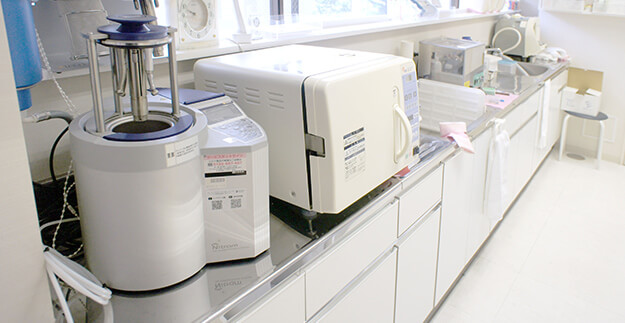 当院では、院内感染防止のために滅菌・消毒コーナーを完備しています。それぞれの器具に適した滅菌器を揃え、すべての器具の消毒